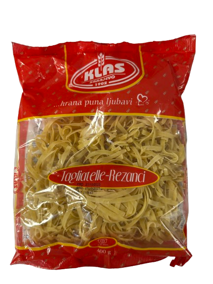 KLAS testeninski rezanci so kakovostne, trde testenine, narejene iz skrbno izbrane pšenične moke. Idealni so za pripravo juh, prilog ali različnih testeninskih jedi. Zaradi svoje teksture in oblike se odlično kombinirajo z različnimi omakami in sestavinami.