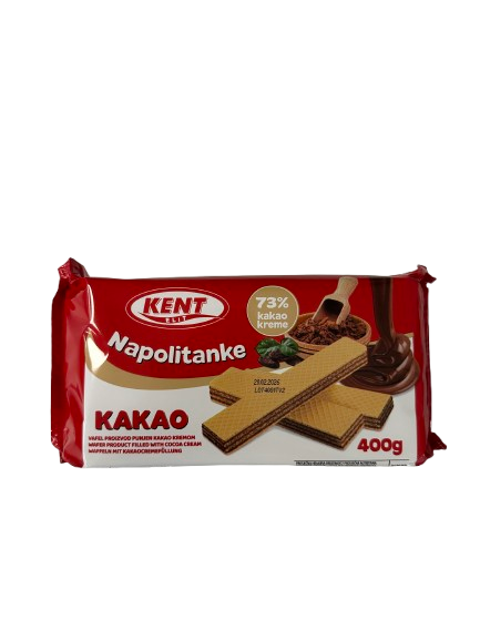 Napolitanka Kent je okusna sladica, sestavljena iz več plasti hrustljavih vafljev in bogatega kremnega nadeva. Prinaša klasičen in priljubljen okus, ki je idealen za sladkanje doma, ob kavi ali kot prigrizek.